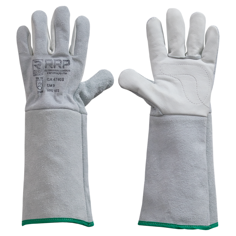 Luva de segurança com dorso confeccionado em couro bovino tipo raspa e palma confeccionada em couro tipo vaqueta, com formato de cinco dedos (forma L), com reforço interno na palma, reforço de costura entre o polegar e o indicador e entre dedos anelares, acabamento com viés