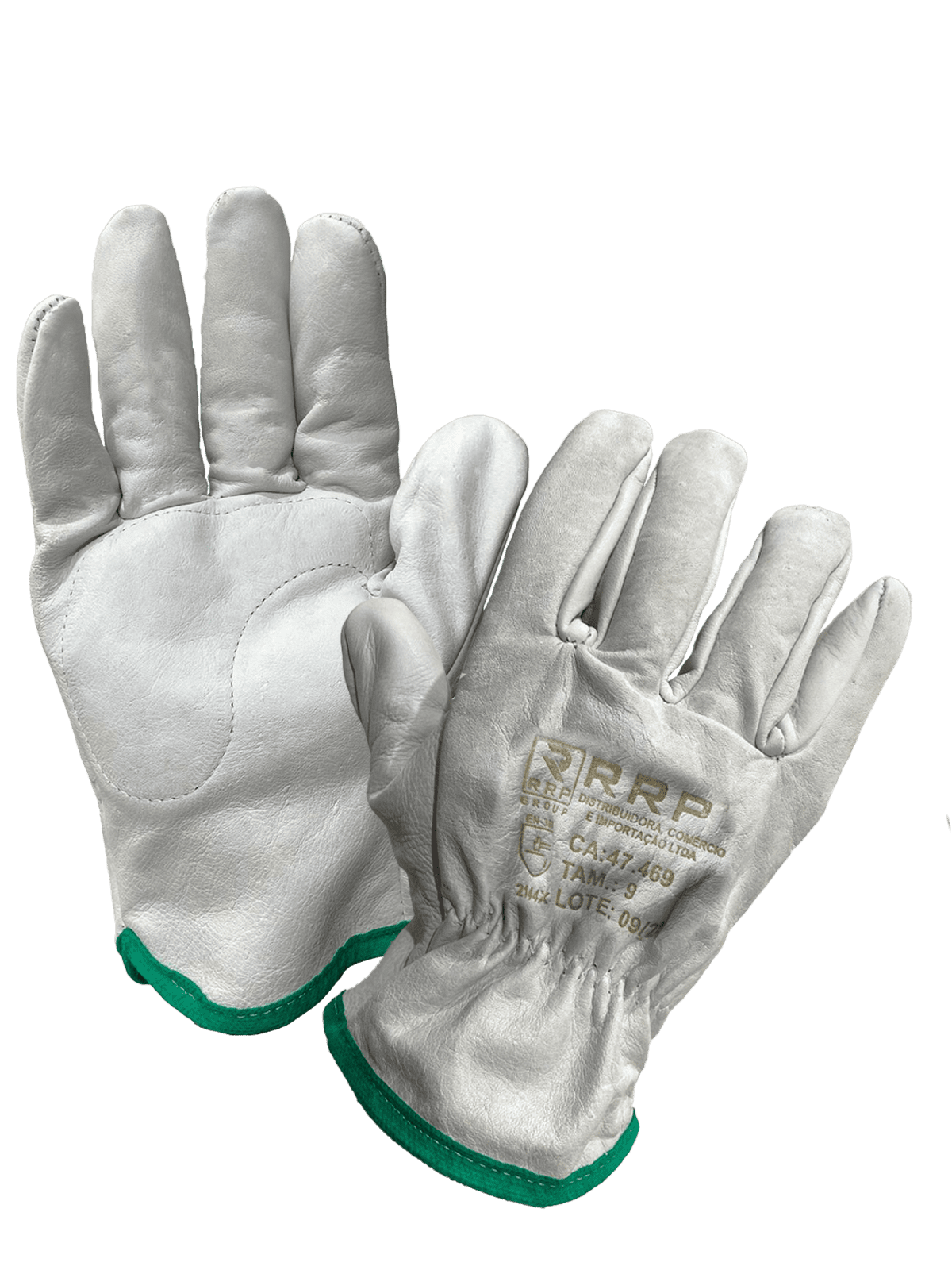 Luva de segurança confeccionada com vaqueta curtida ao cromo, com formato de cinco dedos (forma L), com reforço na palma, reforço de costura entre o polegar e o indicador e entre os dedos anelares, acabamento com viés verde.